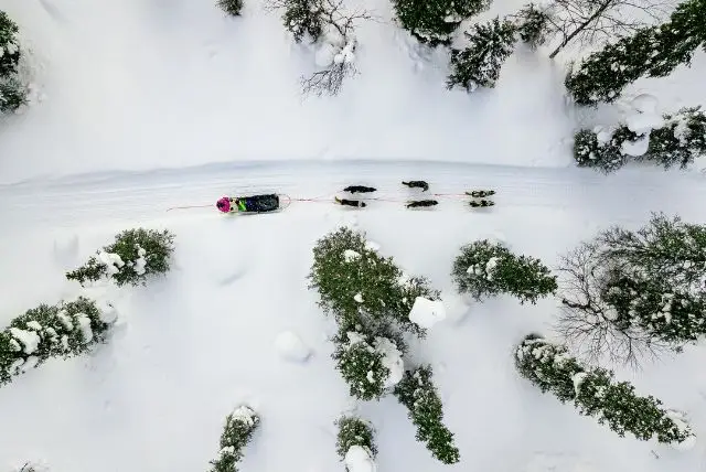 הנסיעה ביערות שונה לחלוטין מהאגמים. היא איטית יותר ודורשת שליטה מדויקת יותר. העצים מכוסים שלג ויוצרים מראה כמעט ציורי. האור שחודר בין הענפים מוסיף עומק לחוויה. מדובר באחד הנופים היפים ביותר בלפלנד. החוויה כאן אינטימית יותר ושקטה.